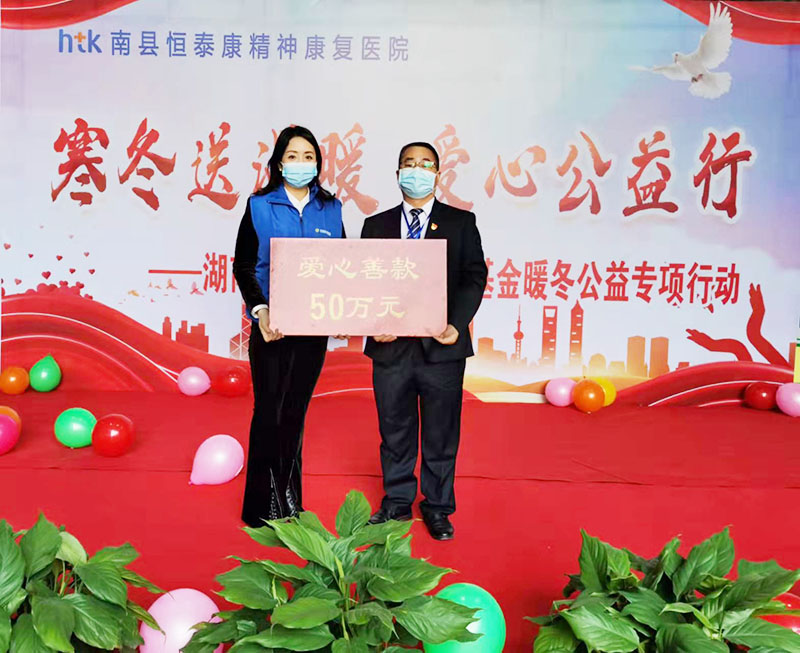 12月30日上午,湖南省民政廳慈善辦主任江曉軍等領(lǐng)導(dǎo)一行蒞臨南縣恒泰康醫(yī)院,向南縣恒泰康醫(yī)院捐贈(zèng)愛心善款50萬(wàn)元,用于減輕南縣200多名精神障礙患者及其家屬的醫(yī)療負(fù)擔(dān)。